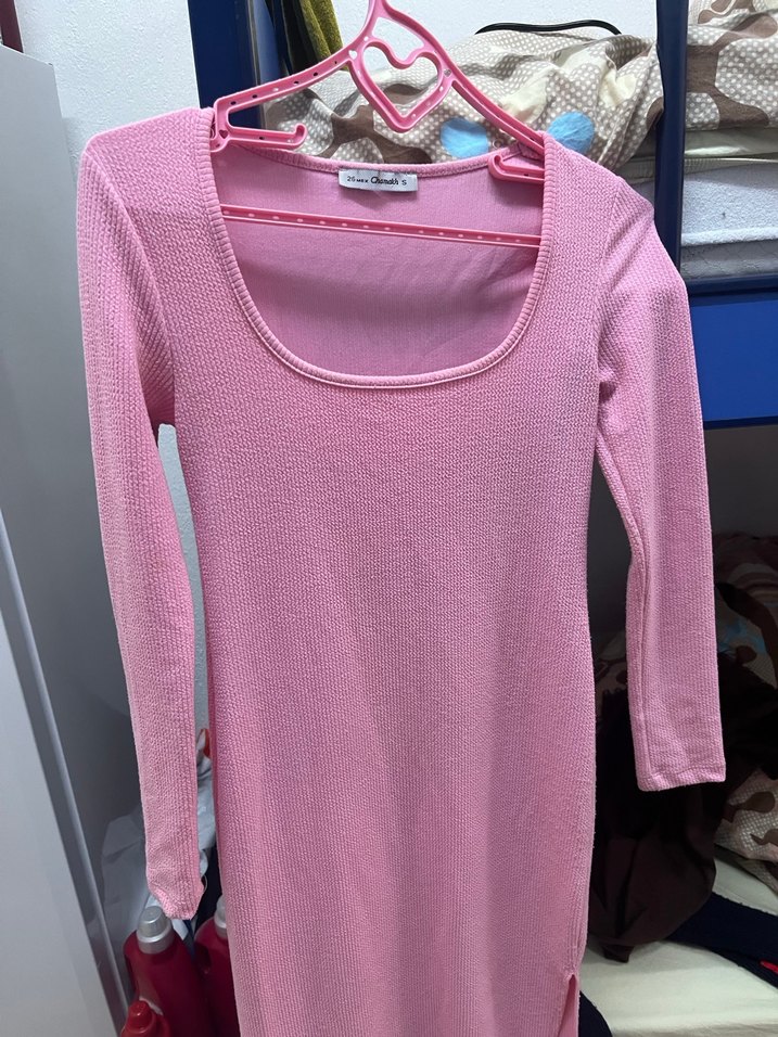 Pembe renkte, uzun kollu ve kare yaka detaylı, vücuda oturan elbise. Düz ve minimal tasarımıyla günlük kullanıma uygundur.