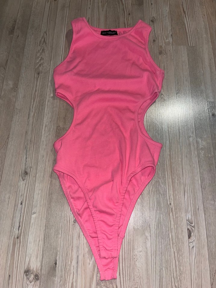 Hiç giyilmedi. Yumuşak kumaştan yapılmış, pembe pastel renkte, yüksek yakalı ve yanları yırtmaçlı kolsuz bodysuit