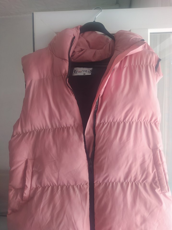 Pastel pembe renkte, yüksek yakalı ve fermuarlı kadın yelek. Yumuşak ve sıcak kumaştan, normal midi boyda ve ince kesim. Günlük rahat sokak stili için uygun, kolsuz tasarım.