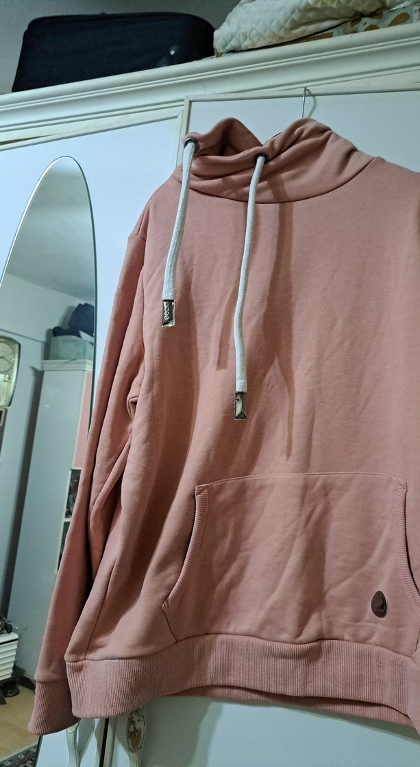 Pembe pastel renkte, yüksek yakalı ve uzun kollu, rahat kesim kadın sweatshirt. Günlük sokak stiline uygun yumuşak kumaştan yapılmıştır.