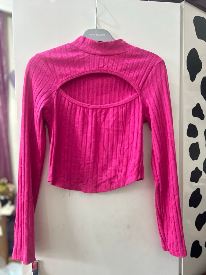 Pembe, dar kesim triko kazak, yüksek yakalı ve uzun kolludur. Yumuşak sentetik örgü kumaştan üretilmiş ve ön kısmında benzersiz bir kesim detayı vardır.