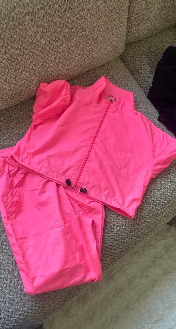 Kadın eşofmanı, bol kesim, yüksek yaka ve kısa kollu tasarıma sahiptir. Fermuarlı ve sentetik kumaştan yapılmıştır, dış mekan sokak stili için uygundur. Canlı pembe renkli midi boy pantolon içerir.