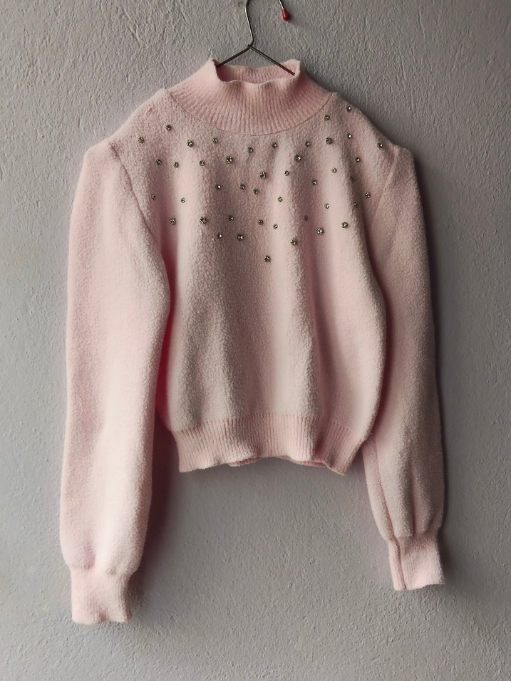 Pembe renkli, yüksek yakalı, uzun kollu ve bol kesim kadın triko kazak. Üst kısmında küçük boncuk detayları bulunur. Günlük kullanıma uygun, midi uzunlukta rahat bir parça.