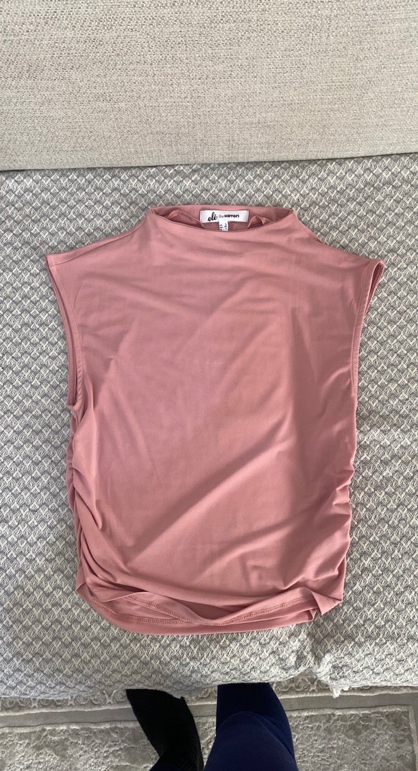 Yüksek yakalı, kolsuz ve vücuda oturan hamile atlet. Yumuşak sentetik kumaştan, yanlarda drapeli ve pastel pembe renkte, rahat sokak stili için uygun.