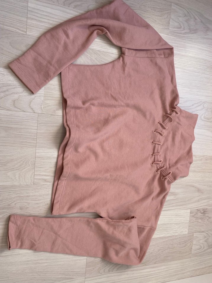 Pastel pembe renkte, yüksek yakalı ve uzun kollu
