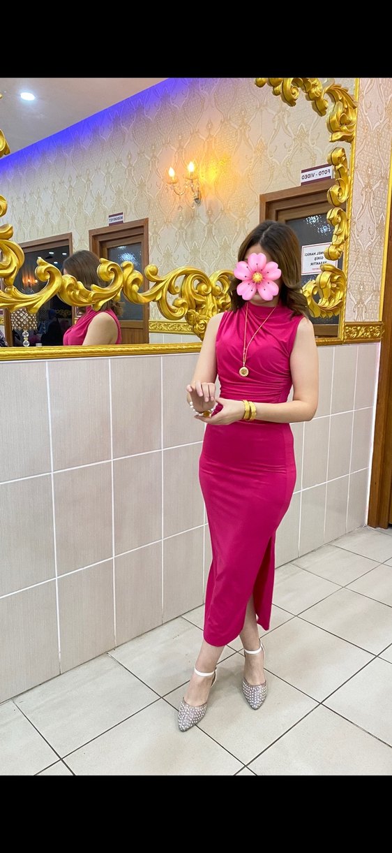 Yüksek yakalı, kolsuz, drapeli ve ipeksi kumaştan yapılmış pembe uzun, vücuda oturan elbise. Canlı renk ve çiçek deseniyle düğünler için uygun, çağdaş ve iddialı.