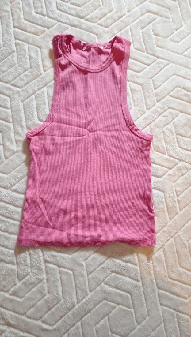 Pembe, yüksek yakalı, kolsuz kadın atlet. Pamuk kumaştan, normal boyda ve vücuda oturan kesim. Günlük ve athleisure tarzına uygundur.