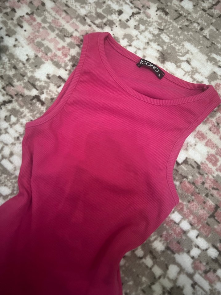 Parlak pembe renkte, yüksek yakalı ve kolsuz, vücuda oturan kadın atlet. Yumuşak ve sıcak kumaştan, ince kürk detaylı, günlük sokak tarzı için uygun.