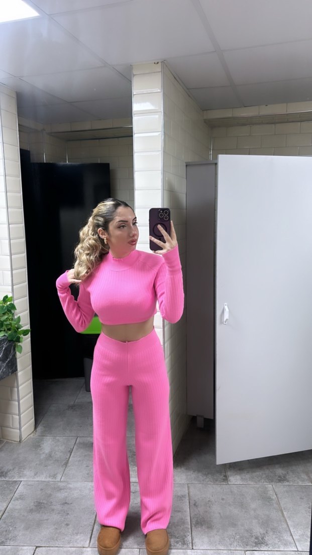 Pembe pastel renkte, yüksek yakalı ve uzun kollu, vücuda oturan kadın eşofman takımı. Midi boy ve yumuşak, sıcak kumaştan, rahat ve şık athleisure tarzda.