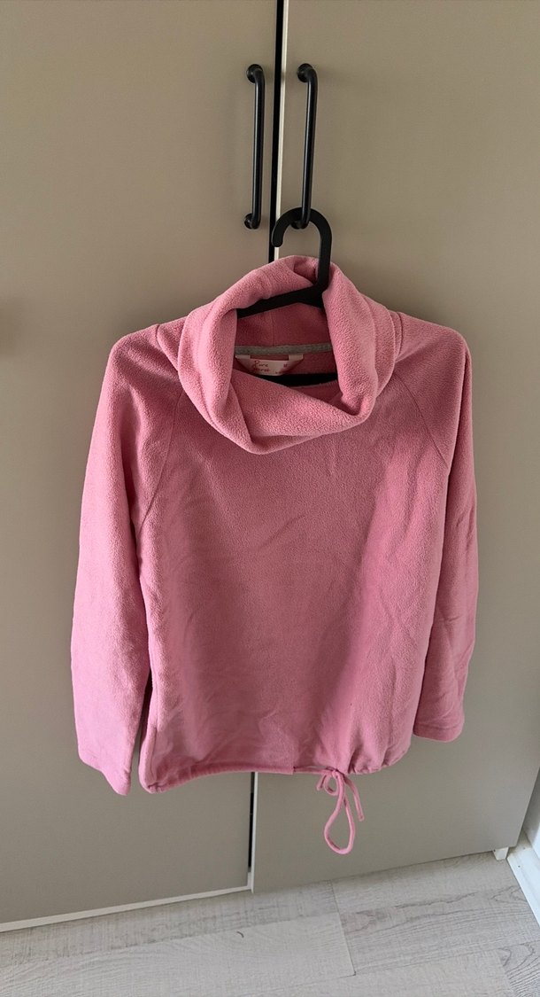 Pembe renkte, yüksek yakalı ve uzun kollu, yumuşak ve sıcak kumaştan kadın sweatshirt. Salaş kesim ve drapeli tasarıma sahip, normal uzunlukta, günlük rahat kullanım için uygundur.
