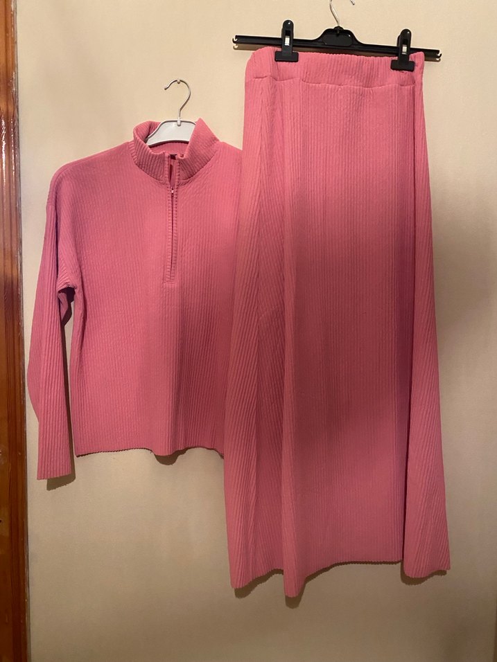 Pembe pilili dokulu, yüksek yakalı, uzun kollu etekli takım