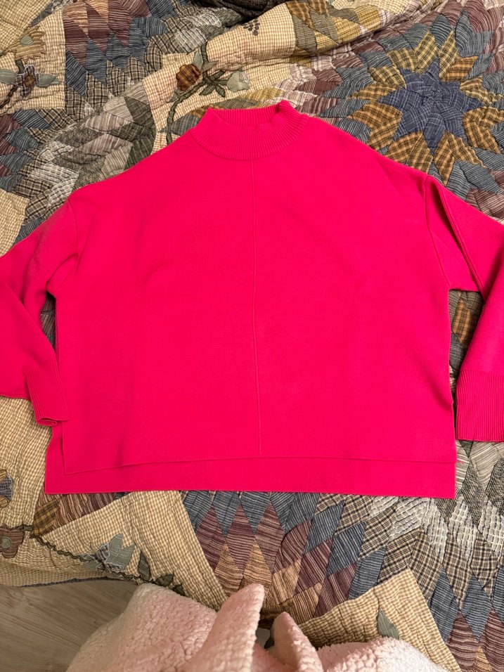 Yumuşak ve sıcak kumaştan yapılmış, uzun kollu, yüksek yakalı, pembe renkli bol kesim kazak. Renkli ve rahat bir tarz sunar.