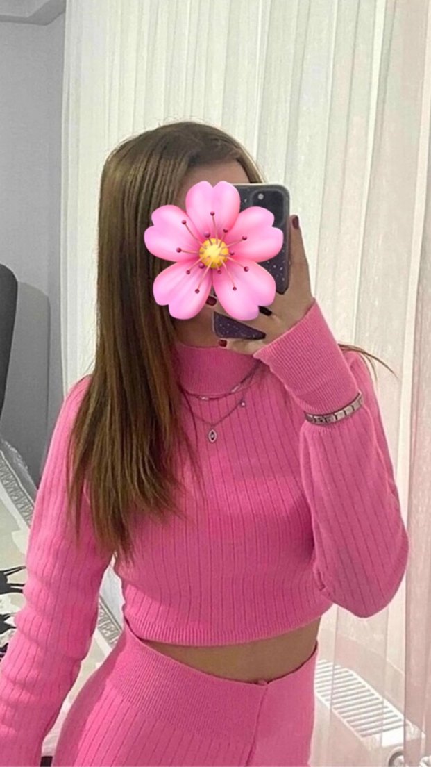 Pembe renkli, yüksek yakalı, uzun kollu ve çiçek desenli triko kazak, rahat ve cesur bir tarz sunar.