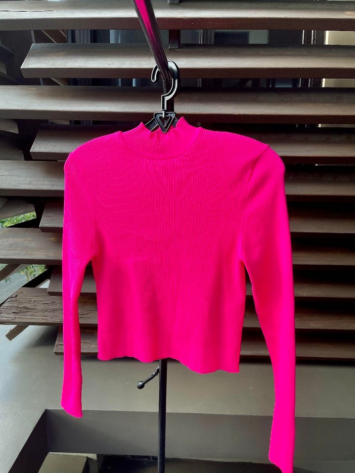 Yüksek yakalı ve uzun kollu, pembe renkli, vücuda oturan örgü kadın kazak. Minimalist sokak stili için uygun, günlük kullanıma ideal midi uzunlukta.