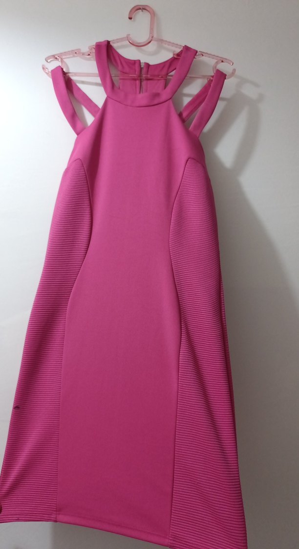 Fitted kesim pembe abiye elbise, ince askılı ve yüksek yakalıdır. Arkada fermuarıyla modern ve minimal tarzda, parti için uygundur.