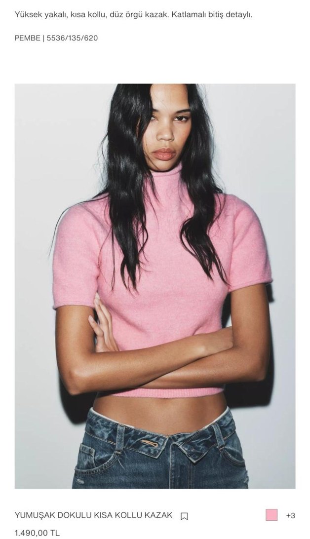 Yumuşak denim kumaştan yapılmış, pembe renkli ve yüksek yakalı, kısa kollu, vücuda oturan crop top. Pastel tonu ve sade tasarımıyla günlük kullanıma uygun rahat şıklık sunar.