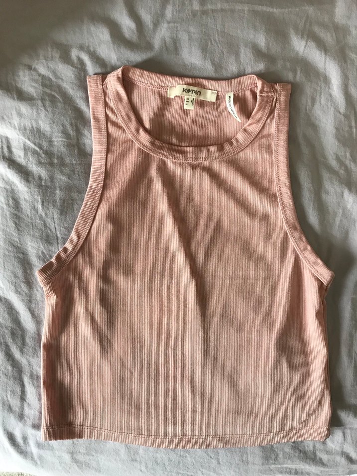 Yüksek yakalı ve kolsuz, pembe renkli, pastel tonlarda, vücuda oturan kadın atlet. Günlük rahat ve şık sokak stili için uygundur.