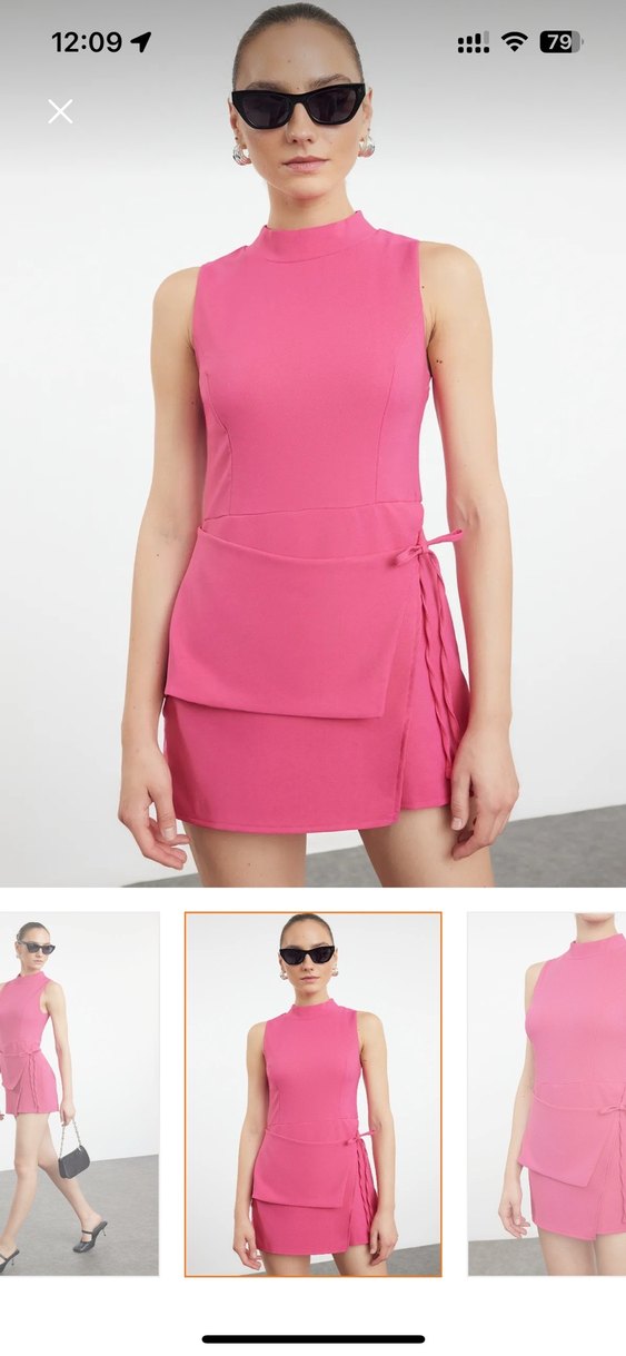 Pembe, yüksek yakalı, kolsuz mini elbise, düz kesimi ve yan bağlama detayıyla romantik buluşmalar için şık ve minimal bir tasarıma sahip.