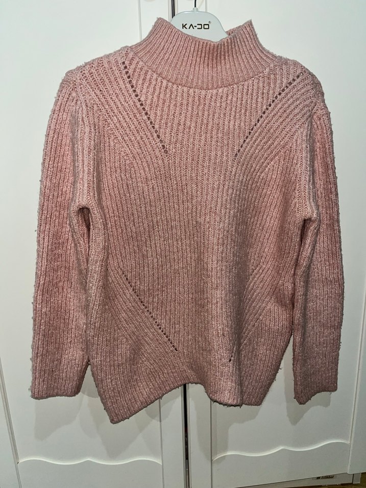 Pembe renkte, yüksek yakalı, uzun kollu ve bol kesim örgü kadın kazak, normal midi boyda, rahat günlük kullanım için uygundur.