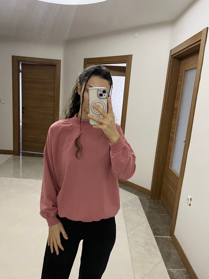 Pembe pastel renkte, yüksek yakalı ve uzun kollu salaş kadın sweatshirtü. Yumuşak ve sıcak kumaştan üretilmiş, günlük kullanım için rahat ve şık bir model.