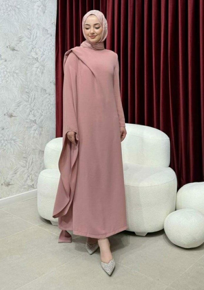 Pembe pastel tonunda, yüksek yakalı ve uzun kollu, salaş kesim uzun elbise. krep kumaştır 1 defa giyildi şalıyla gönderilecektir 163 boyum var 50 kiloya kadar olacaktır ben beline ince bir kemer kestirdim kemersizde gzldir milladakiler gibi kumaşı kalitesiz değildir