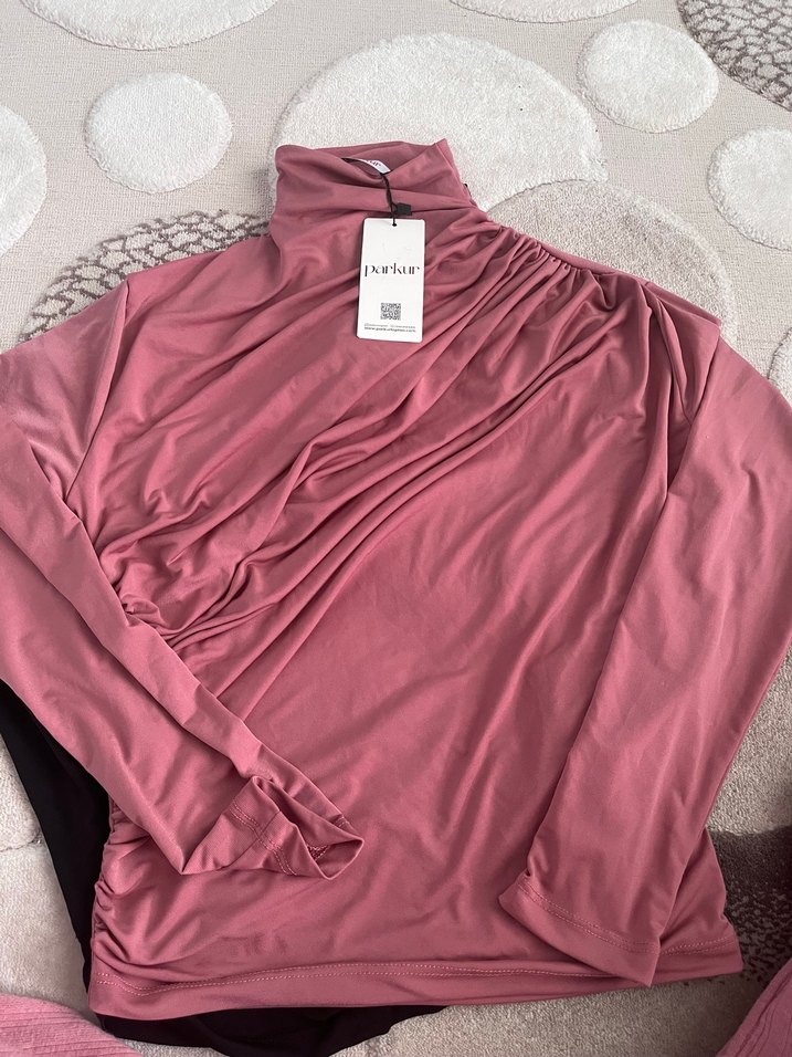 Pembe renkte, yüksek yakalı ve uzun kollu, drapeli ve bol kesimli bluz. Yumuşak sentetik kumaştan, günlük kullanım için uygun sokak stili.