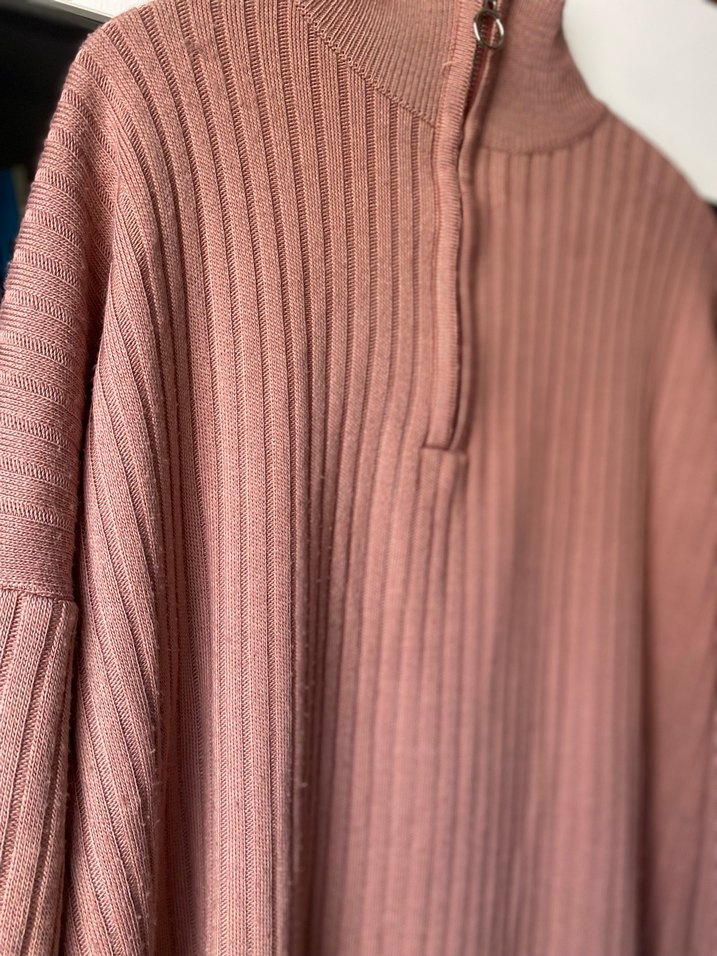 Yumuşak yünden, yüksek yakalı ve uzun kollu, gevşek kesim pembe örgü kadın kazak. Rahat ve günlük kullanıma uygun bir stil sunar.