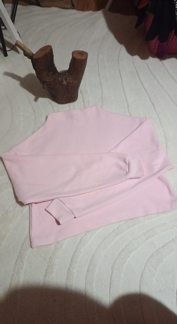 Pembe renkte, yumuşak ve sıcak dokulu, yüksek yakalı, uzun kollu, vücuda oturan midi uzunluğunda kadın kazak. Düz ve rahat sokak stili için uygundur.
