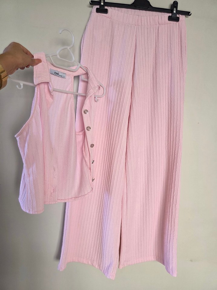 Pastel pembe renkte, yakalı ve düğmeli kolsuz bluz ve Rahat kesim ve midi boy pantolon içerir.