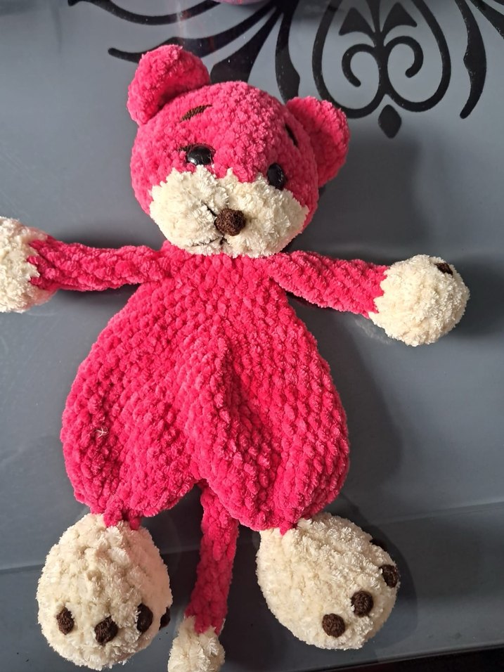 Yumuşak ve renkli pembe peluş ayıcık oyuncak, krem rengi patiler ve yüz detaylarıyla. Dokulu kumaş ve sarılmalık tasarım içerir. Orjinal el örgüsü