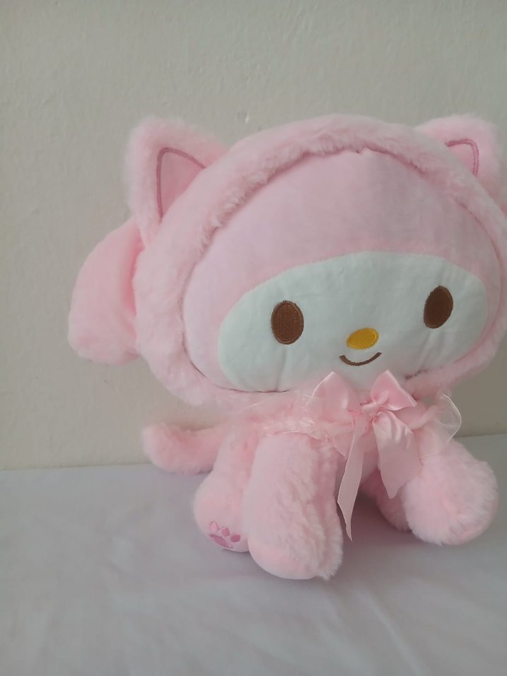Yumuşak pastel pembe peluş oyuncak, sevimli yüz ve kurdele detayı ile. Sarılmak ve dekorasyon için ideal.