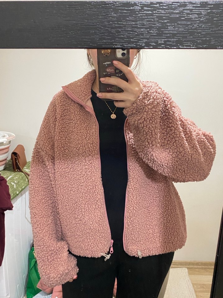 Yumuşak ve sıcak kumaşlı, yüksek yakalı pembe bol kesim ceket. Uzun kollu ve kürk detaylı, rahat kullanım için uygun. ✨ rengi tam resimdeki gibi- 65kg 38-40 giyiyorum