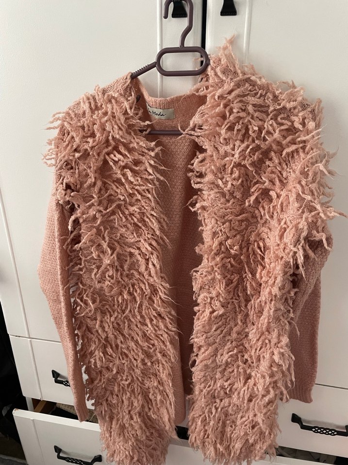 Pembe yün kumaştan, bol kesim ve ön kısmı tüylü detaylı kolsuz yelek. Midi boyda, askısız tasarımıyla bohem stile uygundur.