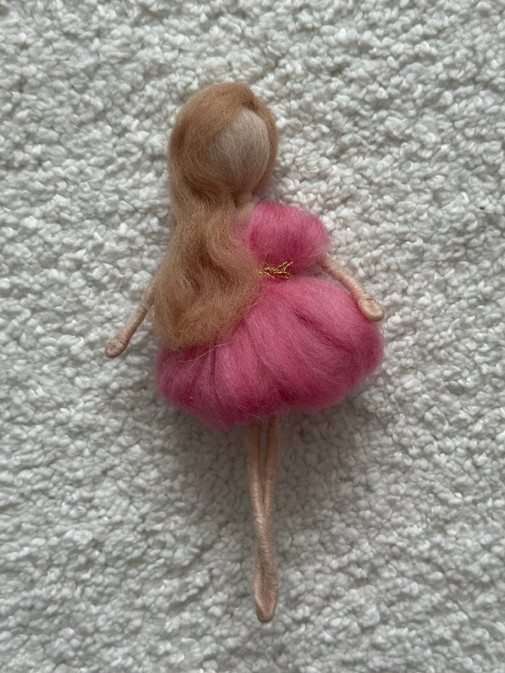 Uzun saçlı, pastel pembe kıyafetli yumuşak yün kumaştan yapılmış el işi bebek. El yapımıdır organik yün kullanılmıştır. Büyük boy 15-16 cm