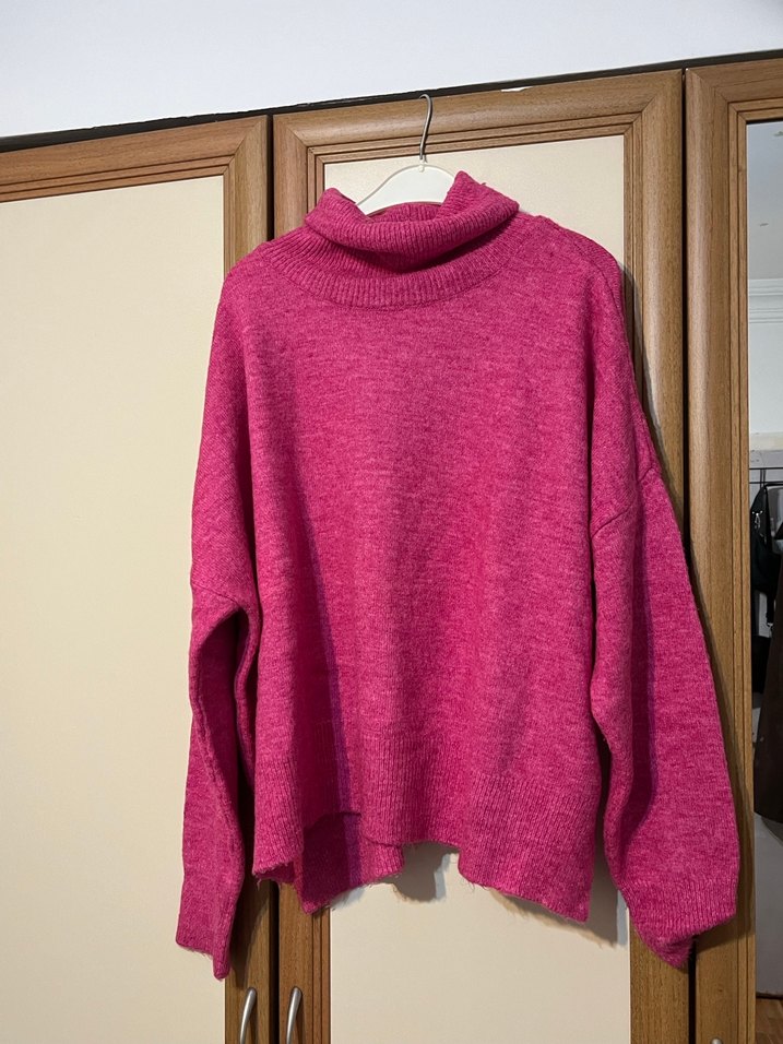 Pembe yünlü, örgü, yüksek yakalı, uzun kollu, bol kesim kadın kazak. Normal uzunlukta, desensiz, günlük kullanım için uygundur.