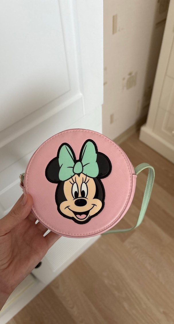 Pastel pembe yuvarlak çanta, mint yeşili fiyonklu Minnie Mouse baskılı ve ayarlanabilir tokalı askıya sahip. Bohem ve retro tarzda.