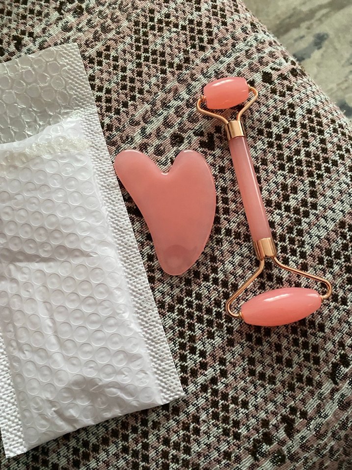 Pembe renkli yüz masaj aleti ve gua sha taşı içeren set, cilt canlandırma ve rahatlama sağlar. SIFIR ÜRÜNDÜR HİÇ KULLANILMAMISTIR