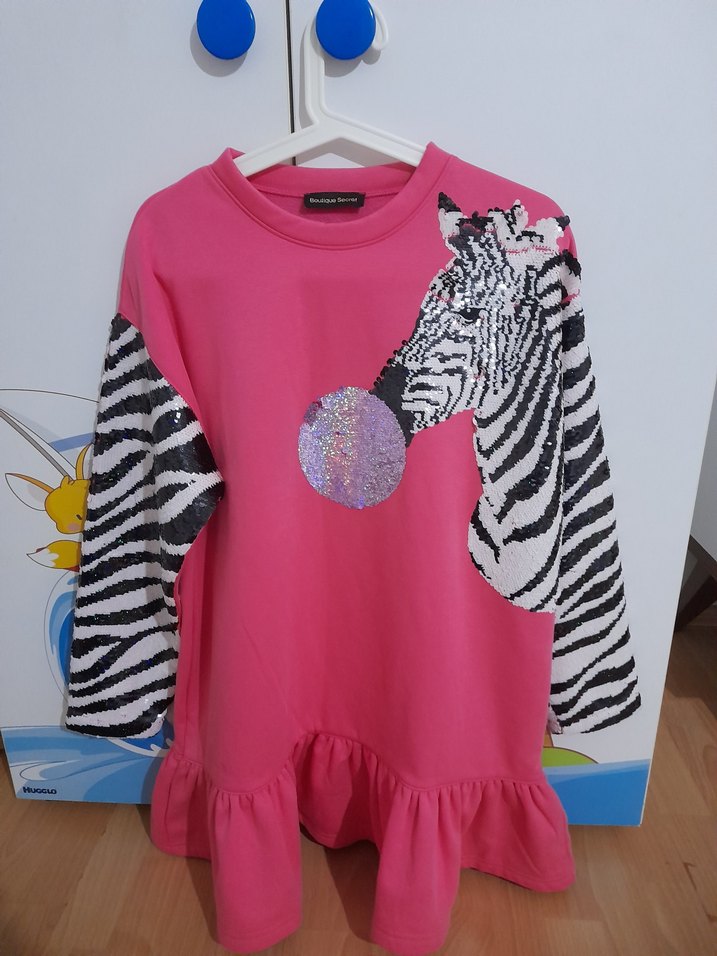 Uzun kollu, zebra desenli kız elbisesi. Yuvarlak yakalı, bol kesim ve fırfırlı etek ucu bulunan pembe renkli sentetik kumaştan üretilmiştir. Canlı renkler ve sokak modası tarzında. arkasinda bir çizik var belli olmuyor giyildiginde