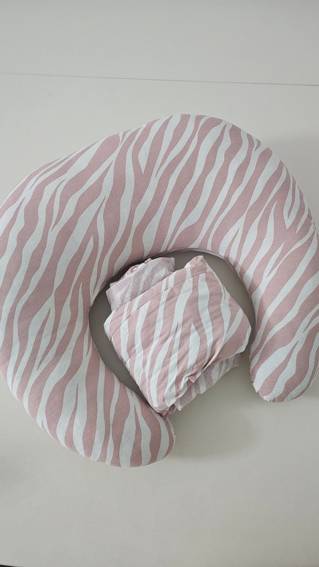 Hamilelik ve emzirme için pastel pembe zebra desenli yumuşak destek yastığı. Resimde gozukdugu gibi minderde sokuk var yirtik degil. ortude de leke var kan ilaci lekesi.