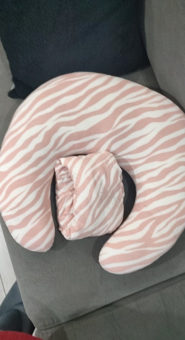 Pastel pembe zebra desenli bu hamilelik ve emzirme yastığı, hamilelik ve beslenme sırasında rahat destek sağlar.