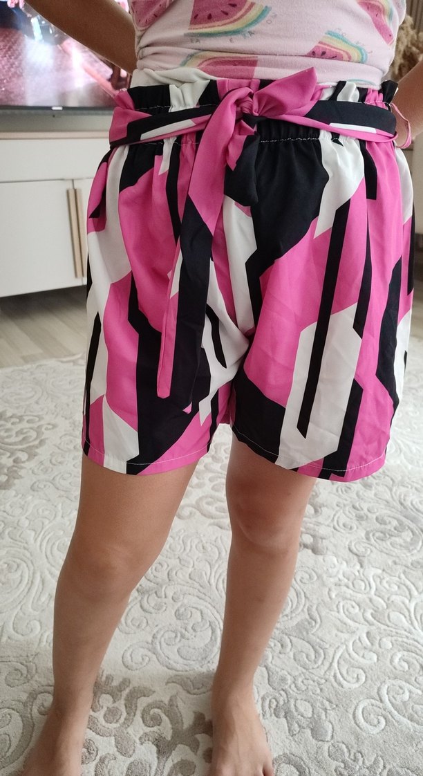 Renkli pembe zebra desenli, fırfırlı, bol kesim hamile mini şort, yumuşak sentetik kumaştan, sokak stili için uygun.