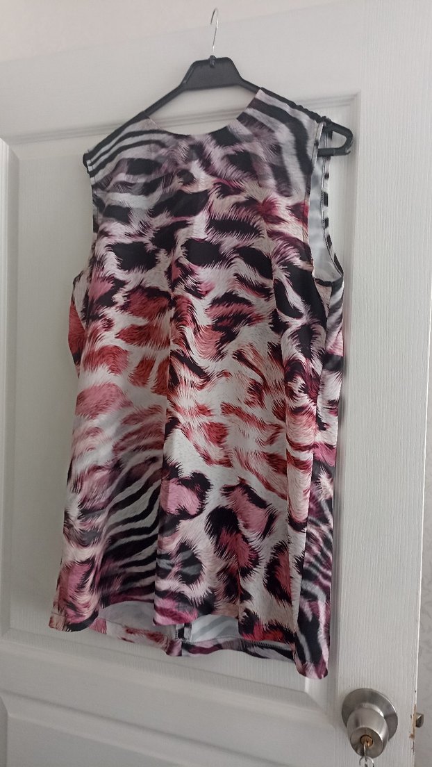 Pembe zebra desenli, drapeli ve kolsuz bluzu. V yaka ve bol kesim, günlük kullanıma uygun modern tasarım.