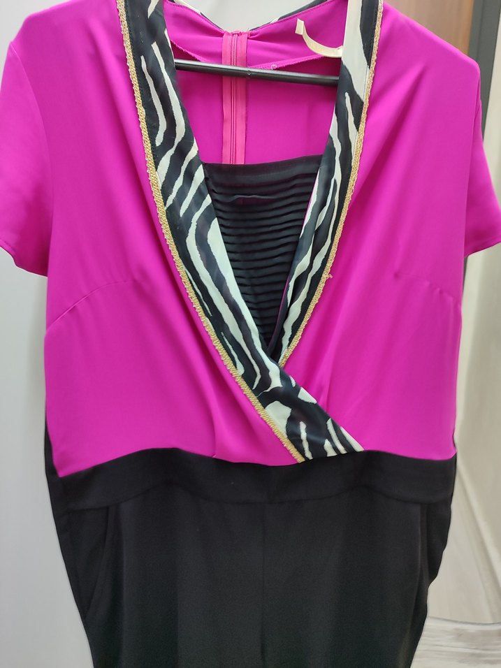 Pembe renkli, zebra desenli V yakalı, drapeli ve salaş kesimli hamile tulumu. Siyah uzun paça alt kısmı ve askılı kısa kollu tasarımıyla dikkat çeker.