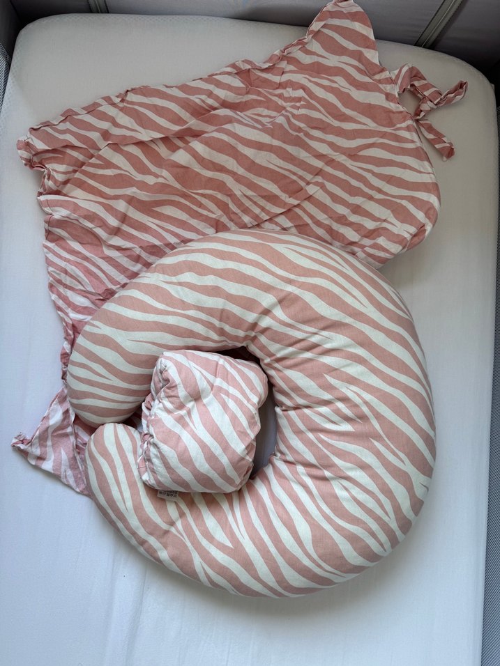 Pembe zebra desenli hamile ve emzirme yastığı, annelere rahat destek sağlar. Yumuşak kumaşı kullanım kolaylığı sunar.