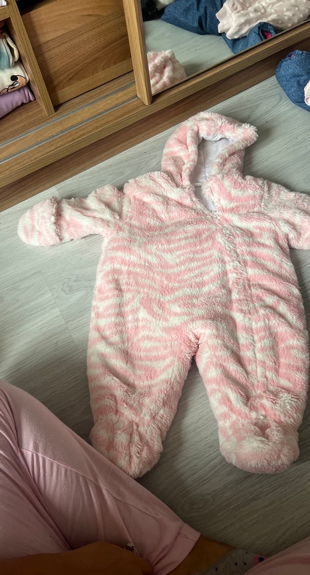 Kapüşonlu, pembe zebra desenli bebek tulumu, yumuşak kürk detaylı, sıcak tutar.