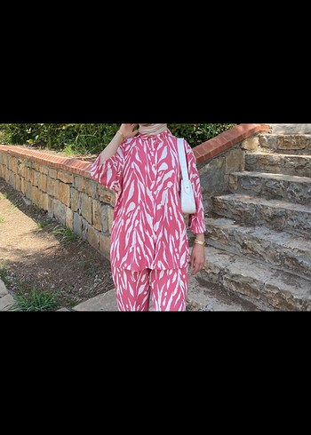 Pembe zebra desenli, rahat kesim kadın takımı. Uzun kollu, V yakalı, düğmeli ve suni kumaştan üretilmiştir. Günlük sokak stili için uygundur. Alt üst takım M beden üst boy : 62 alt boy :93 cm salaş model kollar bilek üstü kısa