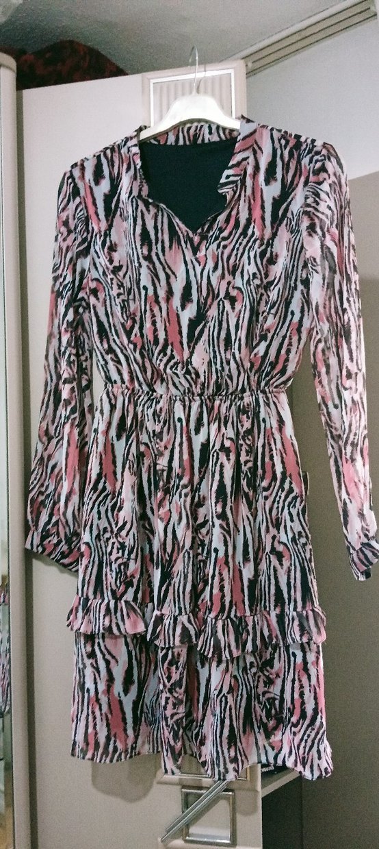 ben XL yim her bedene rahatlıkla olur alan pişman olmaz lastıklı esnektir Pembe zebra desenli uzun elbise, fırfır detaylı, V yakalı ve uzun kolludur. Bol kesim ve bohem tarzındadır, günlük kullanıma uygundur. duvarımdaki tüm ürünler 1 kere kullanılmış sıfır ürünlerdir alana şimdiden hayırlı olsun pazarlık ve tekliflere acığım