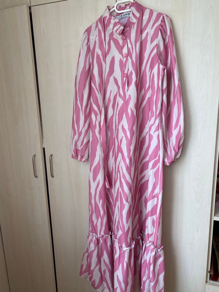 Pembe zebra desenli, uzun kollu ve bol kesim elbise, yüksek yakalı ve fırfırlı detaylara sahip. 38 beden