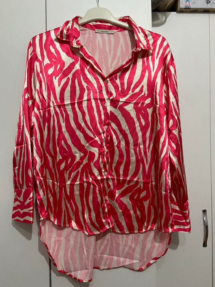 Parlak pembe zebra desenli, uzun kollu, V yakalı kadın gömleği. Düğmeli ve bol kesimli, sentetik kumaştan midi boyda, hafif uzun arka eteğiyle bohem tarzda. Marka temsilidir tek ebattir