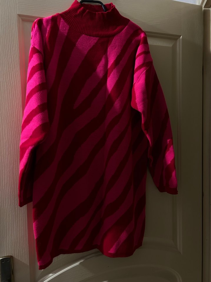 Renkli zebra desenli, pembe, uzun kollu, balıkçı yaka, örgü kumaştan yapılmış bol kesim midi uzunluğunda kazak.